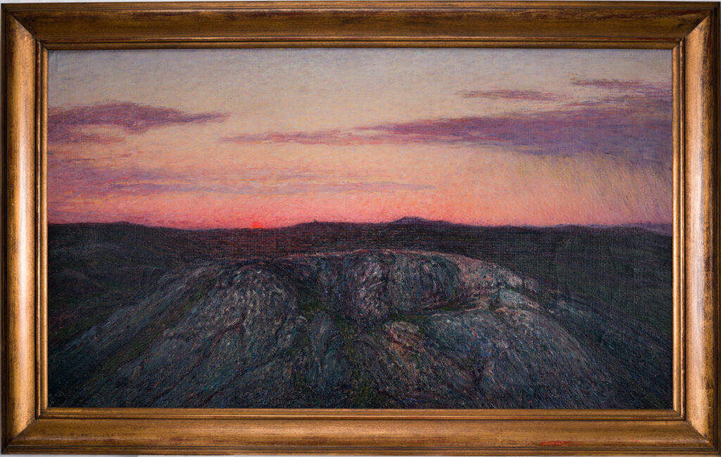 Brevid fotografiet, fast på rummets långsida, hänger en stämningsfull landskapsmålning. Sådana storslagna vyer kan påminna oss om vår plats i universum. I Karl Nordströms oljemålning Skymning Hallandskust ser vi en solnedgång i ett kustlandskap. En varm orange sol sänker sig vid horisonten. I förgrunden finns mörka klipphällar. Himlen är praktfullt rosalila. Målningen har ett nationalromantiskt skimmer med mättade färger. Att stilla betrakta en himlakropp som solen sakta färdas över himlen är säkert rogivande för många, och kan vara påminnelse om världsrymdens oändlighet och ens egen plats i existensen.