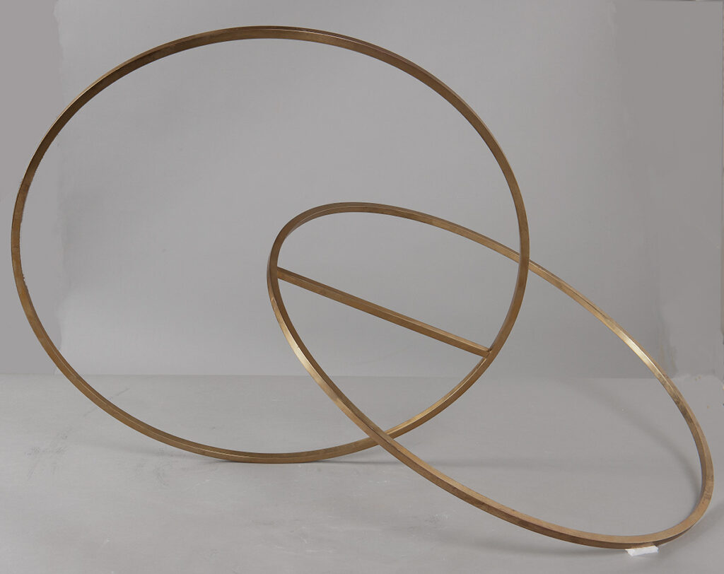 I mitten av rummet svävar mässingsskulpturen Cirklar i förening av Bertil Herlow Svensson. Verket är nästan 1 meter som bredast och består av två relativt tunna mässingscirklar som skär igenom varandra. Den ena cirkeln hänger lodrätt, och den andra vågrätt. De länkas samman med en linjeform. Denna minimalistiska skulptur kan säkert väcka flera associationer. Kanske tänker vi på himlakroppar, eller kanske på vigselringar? Cirkeln som symbol finns inom många trosuppfattningar. Exempelvis i Yin och yang inom kinesisk filosofi, som symbol för den eviga dynamiken och balansen mellan motsatta, men kompletterande krafter, i universum. Inom buddhism och hinduism symboliserar den runda mandalaformen helhet, universum, och inre frid.