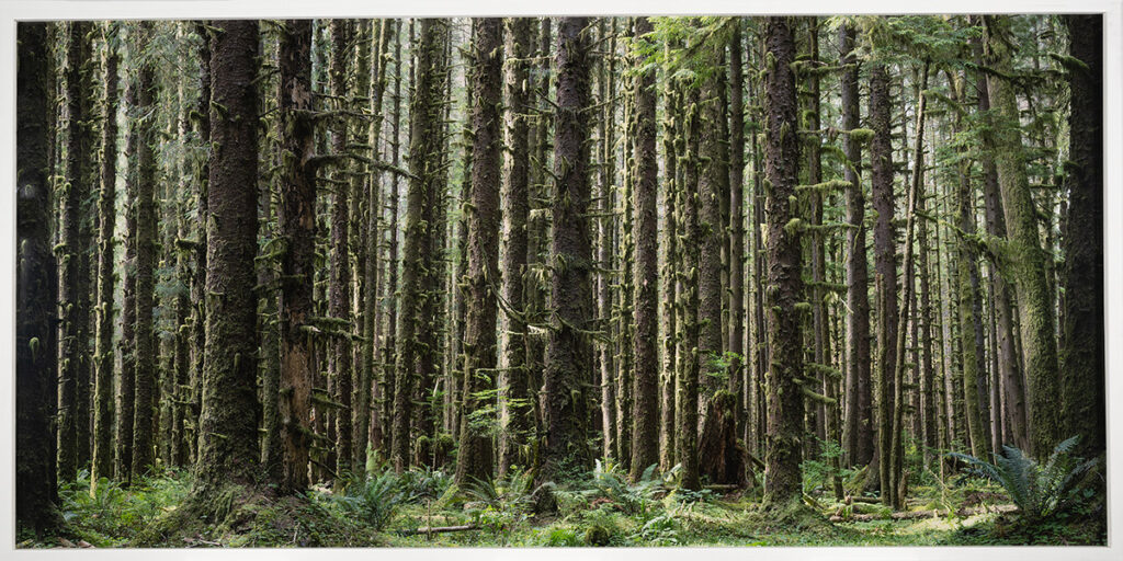 På ena kortsidan i rummet finns ett stort färgfotografi i liggande format. Det föreställer granskog och kommer från serien A Course of Nature, av konstnären Ann Eringstam.Väldigt höga granstammar dominerar bildytan. I en så här tät skog har ljuset svårt att nå ner. Därför blir det mörkt och fuktigt på marken. Mossor, lavar och ormbunkar trivs där. Det är storslaget, drömskt och suggestivt. Kanske också lite trolskt. I en sådan här miljö blir man omsluten av naturen och kanske kan upplevelsen liknas vid att befinna sig i en katedral.