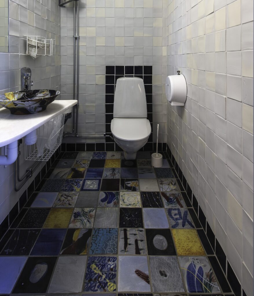 Här på Hallands Konstmuseum kan besökarna få vara ifred i sitt möte med konsten. Särskilt på toaletterna! Här bjöds keramikern Eva Bengtsson, som bor i Frillesås i Kungsbacka kommun, in för att skapa miljön. Till de fyra besökstoaletterna har hon tillverkat sammanlagt ca 6000 unika kakelplattor. De på väggarna är lite diskretare och i porslinslera. De på golvet är i stengodslera och glaserade i olika färger och med olika motiv, lite som ett lapptäcke. Här ser vi bland annat olika växtelement och ord. Det är korta och upprepade engelska ord, som har en positiv ton. Yes yes yes. Peace peace peace till exempel.