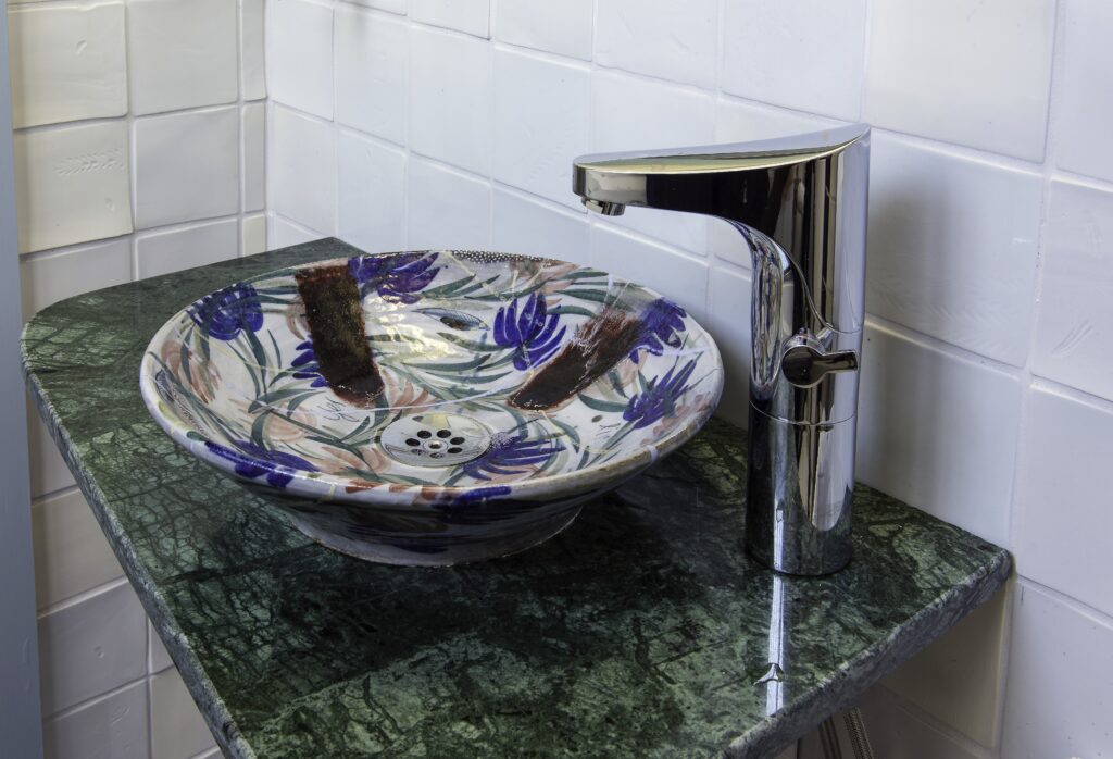 På handikapptoaletten, som ställer högre krav på tillgänglighet, finns ett vanligt handfat i normal storlek. På de andra, mindre toaletterna är också handfaten skapade av Eva.