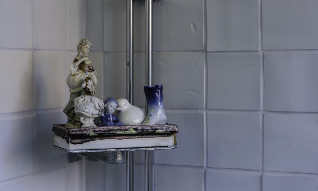 På varje toalett, uppe i ett hörn finns också en liten skulpturgrupp i porslin med figuriner i 1800-talsanda.